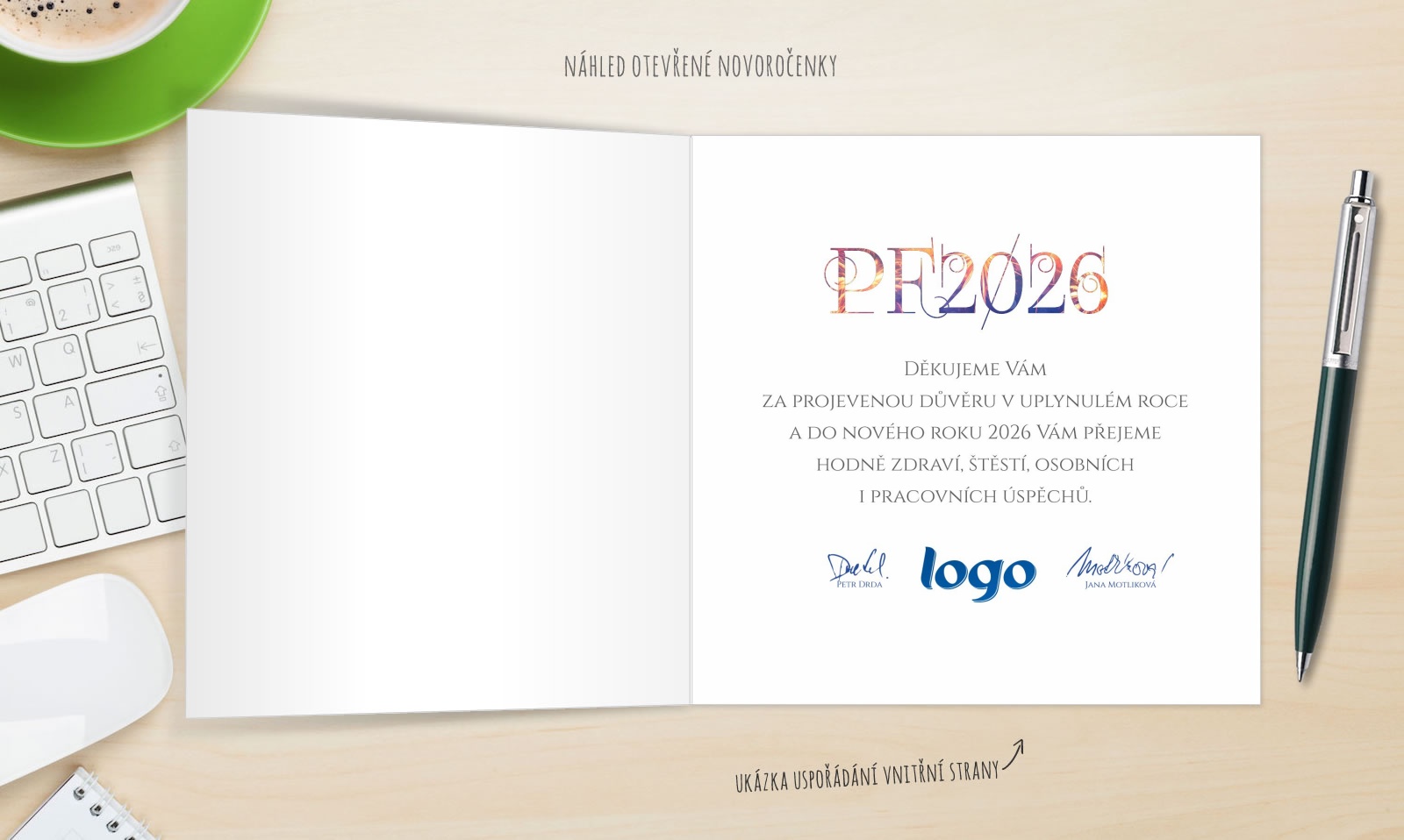 Toto vánoční přání je otevírací ve formě knížky (s textem přání a logo je uvnitř). Přání je do čtvercové obálky. Námi dodávané novoročenky a vánoční přání jsou tištěny na kvalitním 300g křídovém papíře.