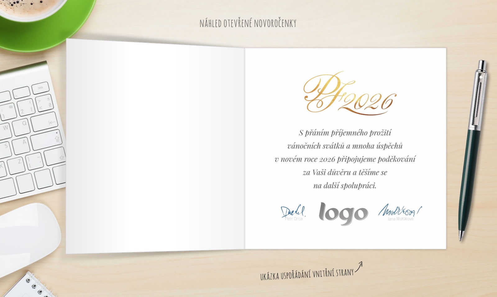 Toto vánoční přání je otevírací ve formě knížky (s textem přání a logo je uvnitř). Přání je do čtvercové obálky. Námi dodávané novoročenky a vánoční přání jsou tištěny na kvalitním 300g křídovém papíře.