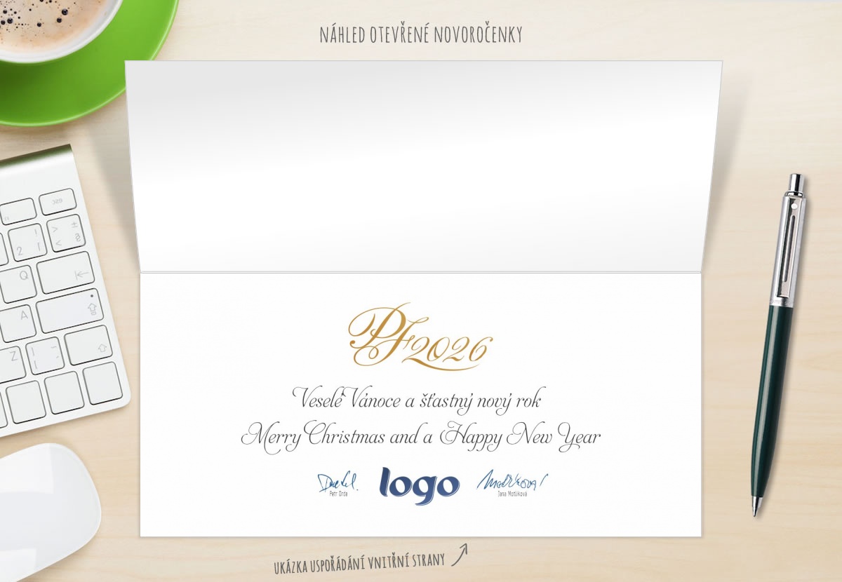 Toto vánoční přání je otevírací ve formě knížky (text přání a logo je uvnitř). Přání je do obálky DL. Námi vyráběné novoročenky a vánoční přání jsou tištěny na kvalitním 300g křídovém papíře.